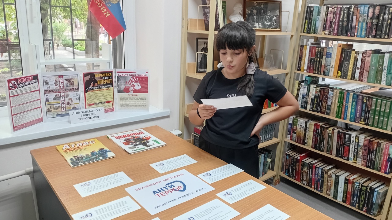 Читатели смогли освежить свои знания о правилах поведения в чрезвычайных ситуациях, участвуя в обучающей викторине «Антитеррор». Гости библиотеки тянули карточку, содержащую описание потенциально опасной ситуации и должны были выбрать из четырех предложенных правильный вариант своих действий.