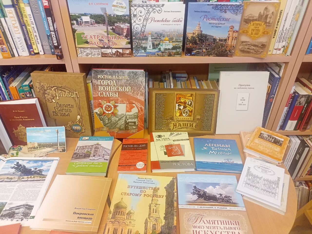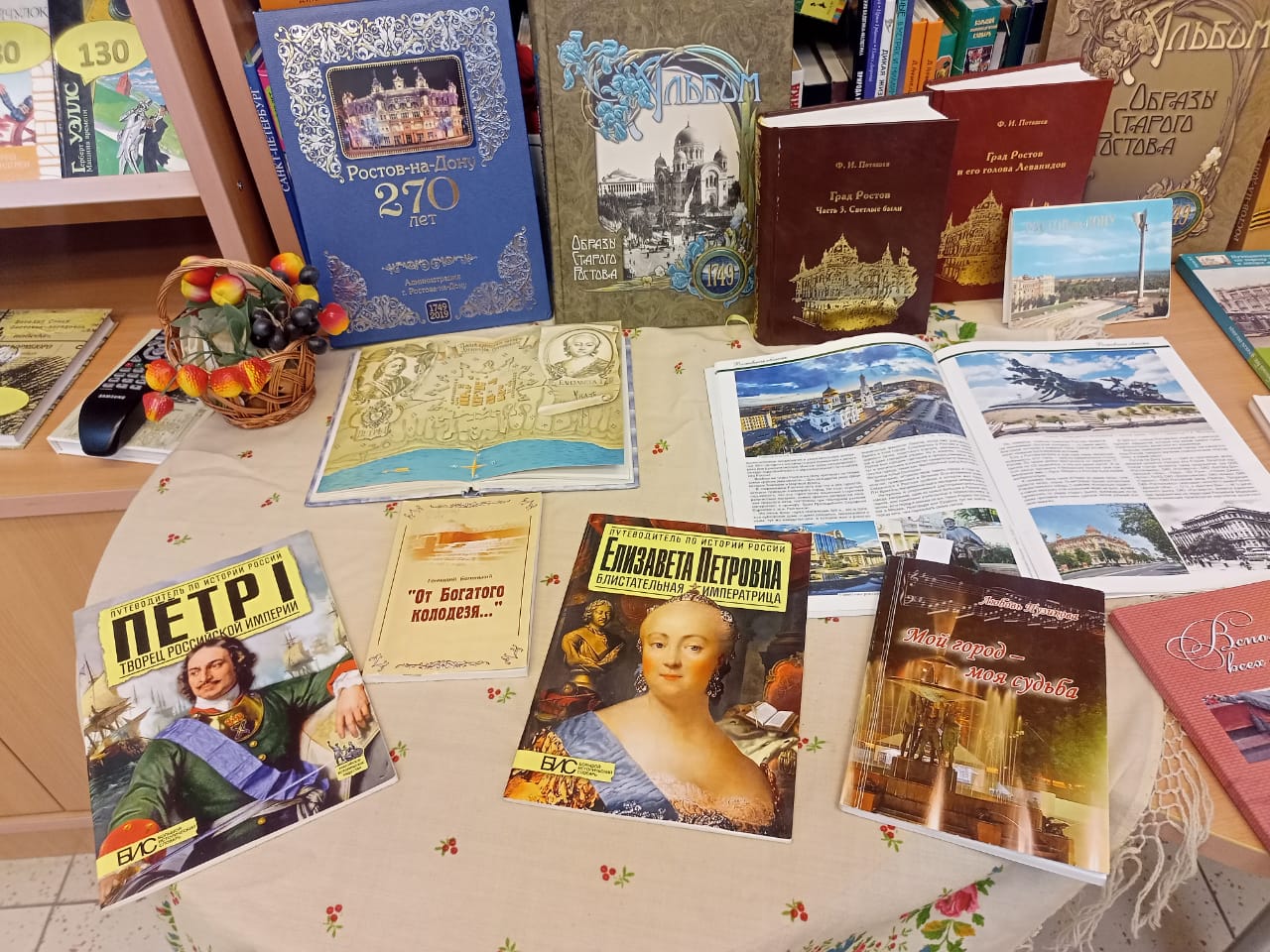 К краеведческому экскурсу была подготовлена книжная выставка «Путешествие по Ростову-на-Дону», на которой была представлена литература о прошлом и настоящем города, о знаменитых людях, родившихся и работавших в Ростове-на-Дону, а также краеведческие издания Л. Волошиновой, В. Смирнова, В. Беленького и др.