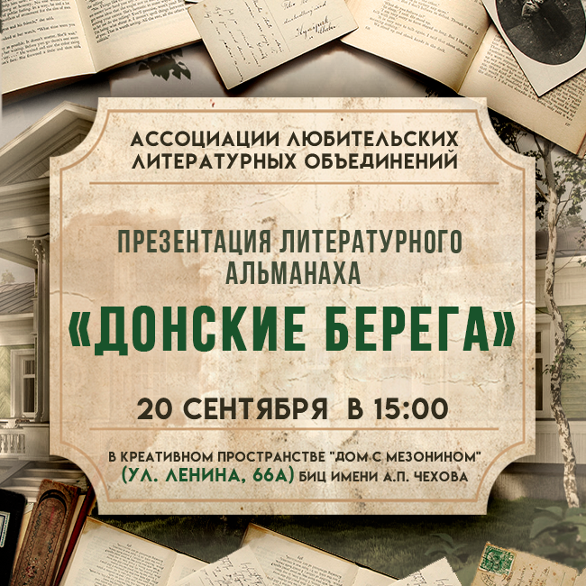 20 сентября в 15:00 в Креативном пространстве «Дом с мезонином» Библиотечно-информационный центр имени А. П. Чехова (улица Ленина, 66А) состоится презентация альманаха «Донские берега» вып. 3.