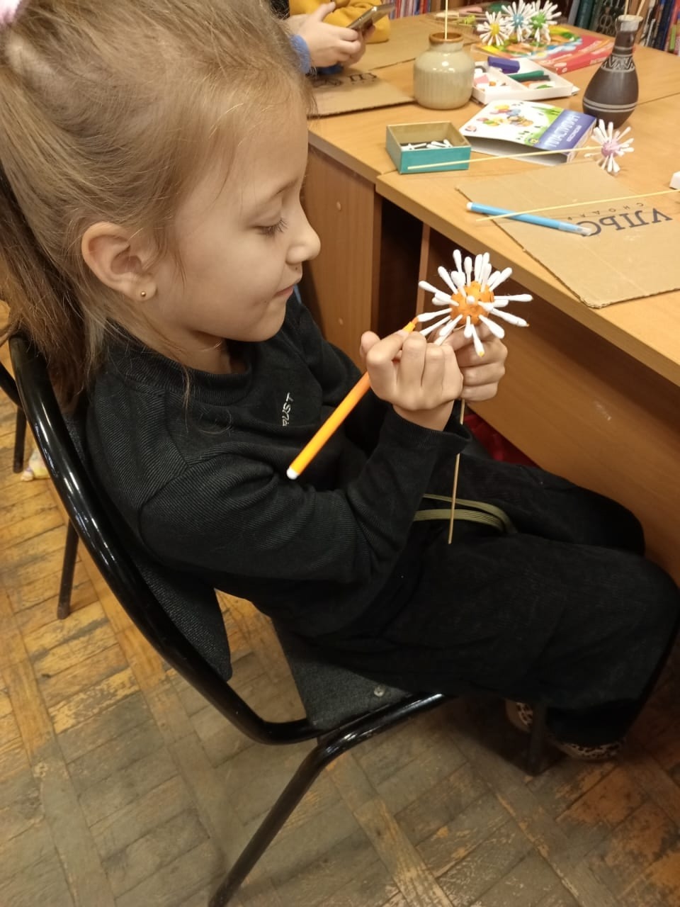 В ход пошли ватные палочки, деревянные шпажки, шарики из пластилина и фломастеры. из этих незамысловатых вещей получились цветы - дубки. «Дубки» — это народное название корейских мелкоцветковых хризантем. Эти растения, включают множество видов и сортов с разнообразными формами и размерами соцветий.