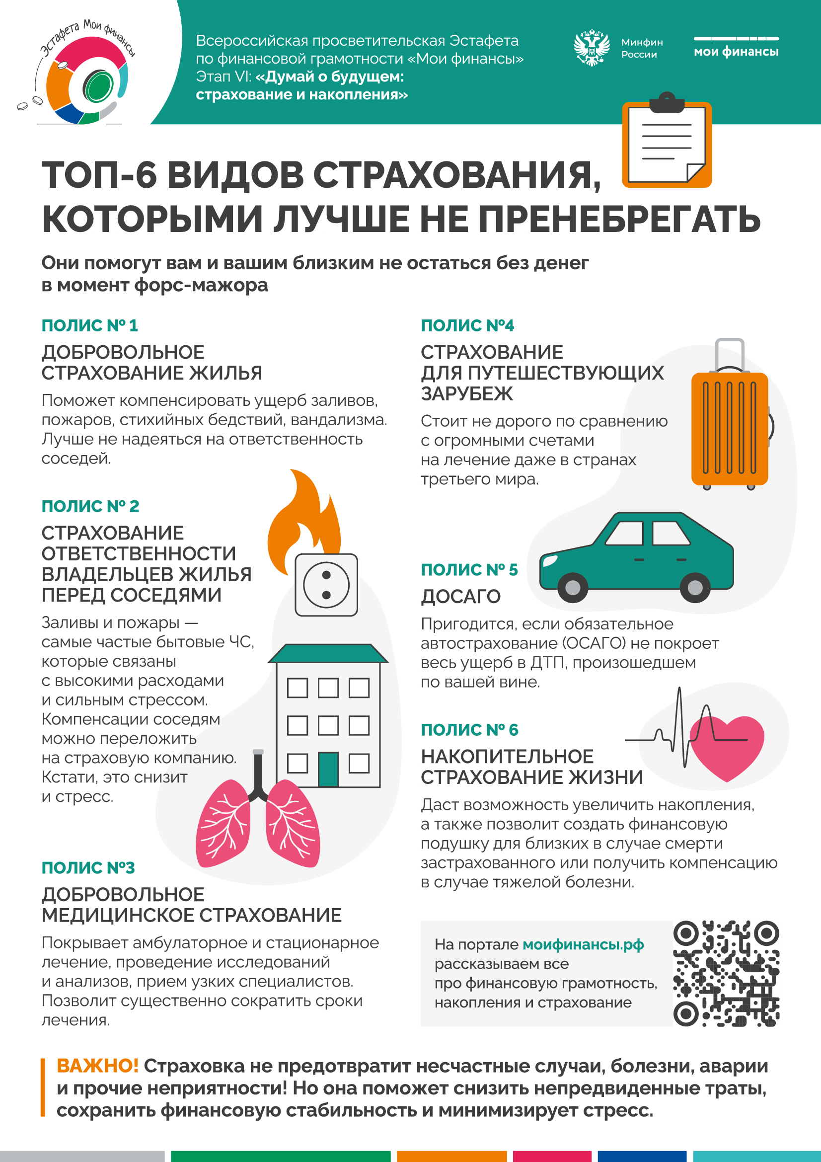 Этап VI: «Думай о будущем: страхование и накопления». Топ-6 видов страхования, которыми лучше не пренебрегать, они помогут вам и вашим близким не остаться без денег в момент форс-мажора: