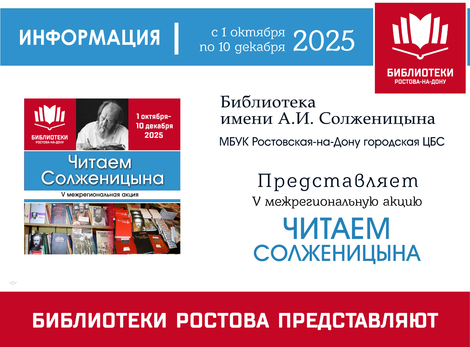 Библиотека имени А. И. Солженицына приглашает принять участие в V межрегиональной акции «Читаем Солженицына». Акция проводится с 1 октября по 10 декабря 2025 года. Чтобы получить сертификат участника в электронном виде и открытку с видом города Ростова-на-Дону, где прошло детство и юность писателя, необходимо разместить на странице «Читаем Солженицына» в социальной сети «ВКонтакте» в сопровождении хэштега #ЧитаемСолженицына пост с цитатой и фотографией обложки книги цитируемого произведения Александра ...