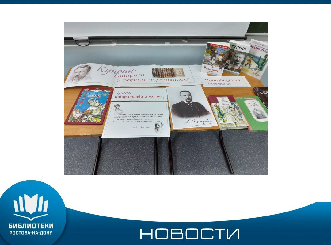 Специалисты Библиотеки имени В. М. Шукшина провели мероприятие в школе № 5 (МАОУ), посвящённое 155-летию писателя со дня рождения: литературный портрет «По страницам творчества А. И. Куприна. Ведущие рассказали обучающимся о том, что встреча посвящена русскому писателю – Александру Ивановичу Куприну, которому в этом году 7 сентября исполняется 155 лет со дня рождения, рассказали биографию писателя, в процессе беседы продемонстрировали видеопрезентацию «А. И. Куприн». Далее специалисты предложили ...