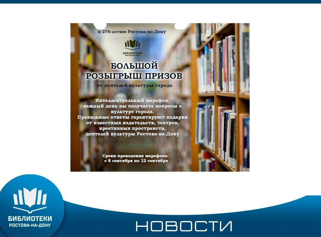 Дорогие друзья! К 276-летию города Ростова-на-Дону Библиотеки Ростова на странице в соцсети ВКонтакте https://vk.com/donlibru?from=groups проведут БОЛЬШОЙ РОЗЫГРЫШ ПРИЗОВ от деятелей культуры города. Интеллектуальный марафон: каждый день вы получаете вопросы о культуре города. Правильные ответы гарантируют подарки от известных издательств, театров, креативных пространств, деятелей культуры Ростова-на-Дону. Важно ответить правильно ПЕРВЫМ - и тогда приз ВАШ! Сроки проведения марафона: с 8 по 12 сентября. Следите ...
