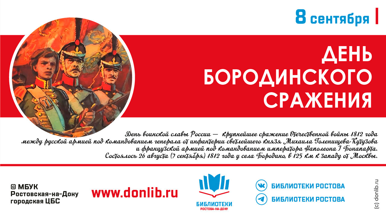 Ежегодно в России 8 сентября отмечается День Бородинского сражения русской армии с французской армией. Этот день установлен федеральным законом «О днях воинской славы и памятных датах России», подписанным Президентом РФ 13 марта 1995 года. Битва около села Бородино между русской армией под командованием полководца Михаила Кутузова и французской армией под командованием императора Наполеона Бонапарта состоялась 7 сентября (26 августа - по старому стилю) 1812 года в ходе Отечественной войны. Эта битва ...