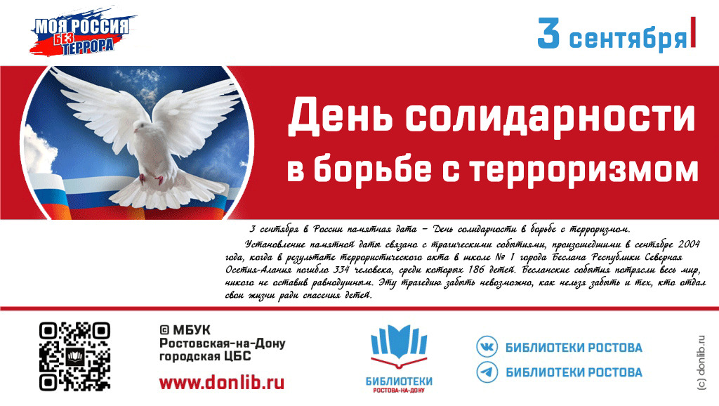 3 сентября - День солидарности в борьбе с терроризмом. Этот день – скорбная дата в российском календаре, напоминающая о трагических событиях, произошедших в Беслане в 2004 году. Тогда, в результате беспрецедентной по своей жестокости террористической атаки, погибли сотни людей, в основном дети. 3 сентября – это не просто день памяти жертв терактов, это символ единения государства и общества в противостоянии глобальной угрозе терроризма. В этот день по всей стране проходят памятные мероприятия: панихиды, ...