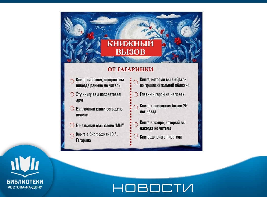 Библиотечно-информационный центр имени Ю. А. Гагарина приглашает всех желающих принять участие в увлекательном книжном вызове и совершить захватывающее путешествие в мир литературы! До 30 декабря 2025 года участникам предстоит прочитать 10 книг из специального списка и поделиться своими впечатлениями. Что нужно сделать: - прочитать как можно больше книг из предложенного списка (чем больше, тем лучше!). - написать рецензию на каждую прочитанную книгу (отзыв, размышления, личные впечатления). Опубликовать ...