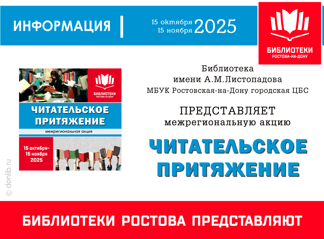Библиотека имени А. М. Листопадова приглашает принять участие в межрегиональной акции «Читательское притяжение». Акция проводится с 15 октября по 15 ноября 2025г. Для участия необходимо: - Стать подписчиком сообщества «Читательское притяжение» в социальной сети ВКонтакте. - Провести мероприятие на тему любимых книг, любимых авторов. Форма мероприятия определяется самостоятельно участниками акции на своих площадках. - По факту проведения мероприятия участник акции должен разместить краткий отчет с ...