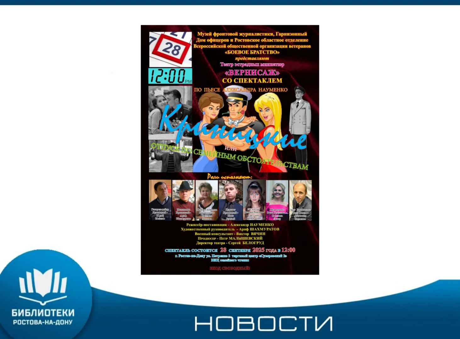 28 сентября в 12:00 в Библиотечно-информационном центре семейного чтения имени Л.Н. Толстого (г.Ростов-на-Дону, ул.Петренко, д.3) пройдет спектакль "Криницкие или отпуск по семейным обстоятельствам", который покажет театр эстрадных миниатюр "ВЕРНИСАЖ" Приглашаем всех на спектакль!!! Вход свободный!!! Следите за новостями на нашем сайте, подписывайтесь на нас в социальных сетях ВКонтакте, Telegram, ОК. ...