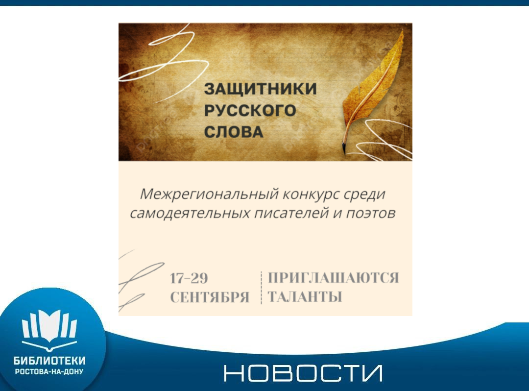 Краснодарская краевая универсальная научная библиотека им. А.С. Пушкина приглашает принять участие в межрегиональном конкурсе «Защитники Русского Слова». Участниками конкурса могут стать самодеятельные писатели и поэты в возрасте от 18 лет и старше, не являющиеся членами творческих союзов писателей, проживающие на территории Южного федерального округа. Конкурс проводится по двум номинациям – «Прозаическое произведение малой формы» и «Поэтическое произведение». Подробную информацию об условиях конкурса, ...