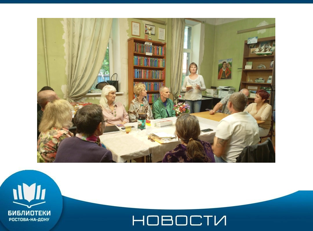 Состоялось очередное заседание Литературно-творческого объединения «Ростсельмаш» в Библиотеке имени М. Ю. Лермонтова (г. Ростов-на-Дону, ул. Брестская, 2/81). Ведущий библиотекарь О. Ю. Круглова провела час юбиляра «Говорят, что жизнь всему научит. Лариса Рубальская». В ее сообщении речь шла о жизненном и творческом пути российской поэтессы Ларисы Рубальской, которая отмечает 24 сентября свое 80-летие. Выступление библиотекаря сопровождалось электронной презентацией. Звучали песни на стихи Ларисы ...
