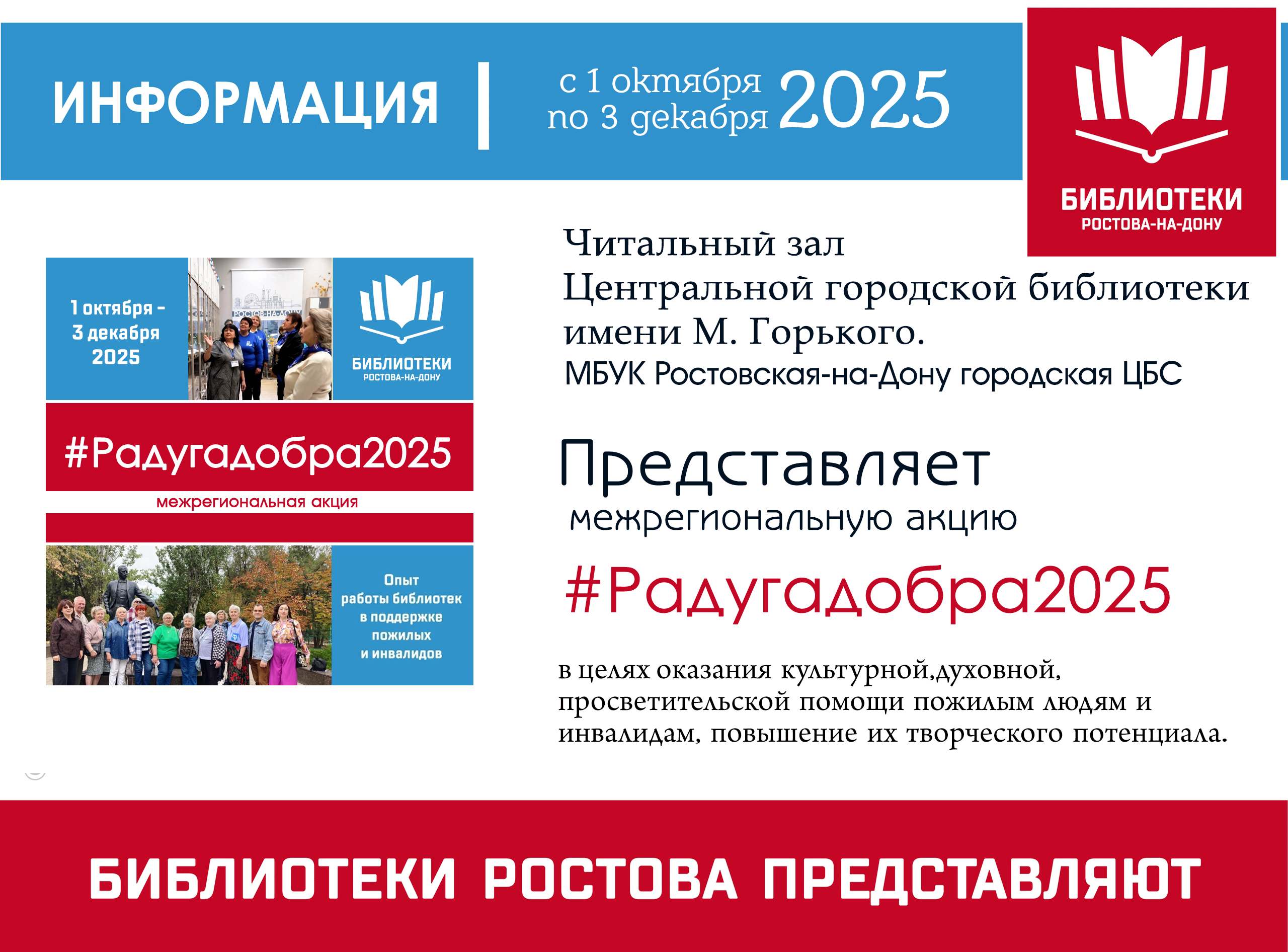 В преддверии Дня пожилого человека Центральная городская библиотека имени М. Горького вновь приглашает всех желающих поучаствовать в межрегиональной библиотечной акции «#Радугадобра2025», которая будет проходить с 1октября по 3 декабря 2025 г. Участники акции должны на странице социальной сети ВКонтакте «#Радугадобра2025» разместить отчет о проведенном мероприятии. Формы работы могут быть любыми: заседания клубов, литературно-музыкальные гостиные, композиции, часы общения, беседы, виртуальные мероприятия, ...